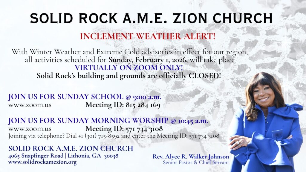 We’re preparing for a transformative journey as we welcome Rev. Alyce Walker Johnson as the new pastor of Solid Rock AME Zion Church. With a heart for God and love for His people, Pastor Johnson brings wisdom and vision to our church family. Join us Sunday, December 1st and invite your family and friends to share in this moment with us.